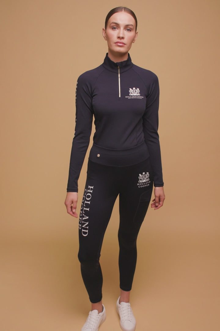 Our technical riding tops are expertly crafted with practicality and form in mind, our base layer offers warmth and comfort hand in hand. Perfect for keeping cool in whilst training while providing an insulating layer during the winter. Crafted from a comfort stretch fabric for ease of movement. Detailed with our signature gold hardware.